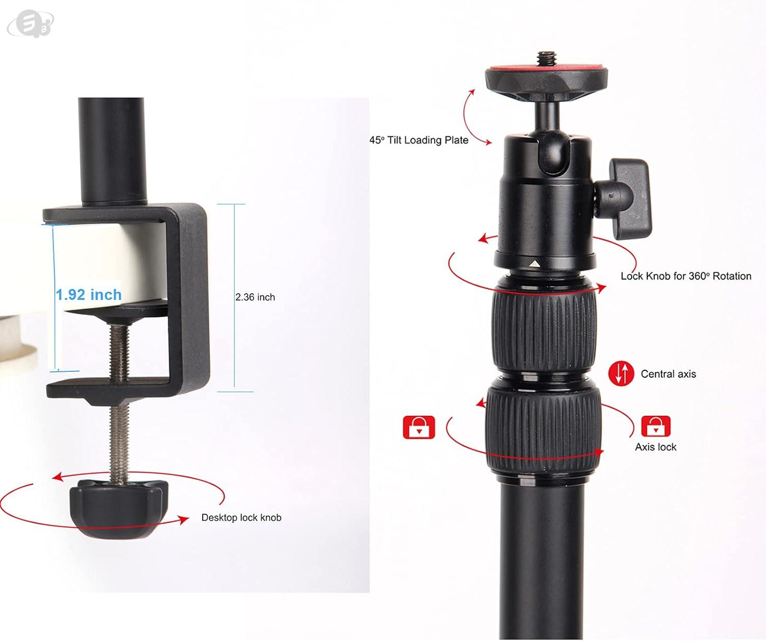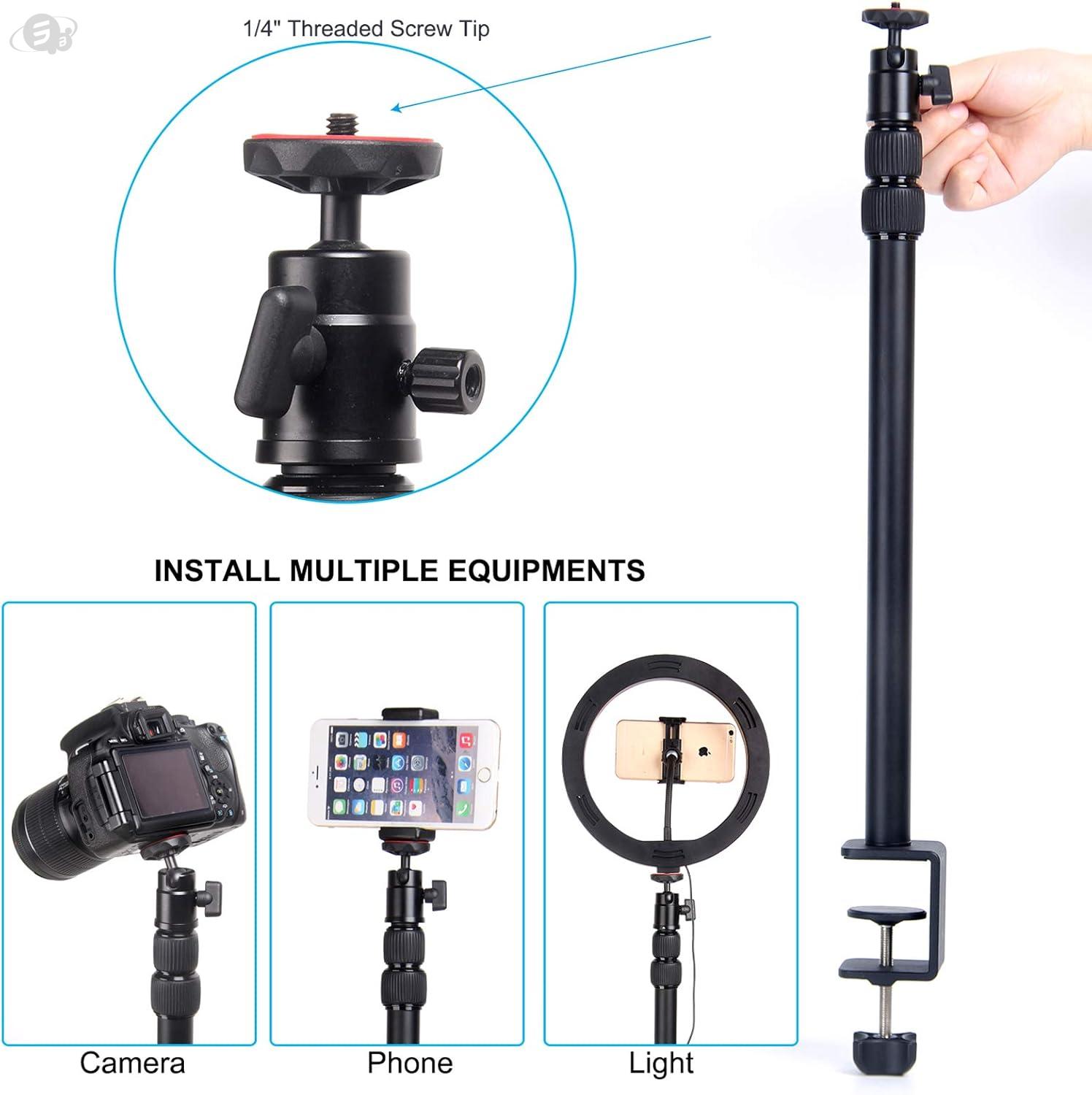 【Applicable and Universal】Desk clamp stand with standard 1/4 screw can be mounted for the most cameras and lights which have a 1/4” adapter, such as ring light, DSLR camera, Action Camera, Video Light, video camera, panel light,mini projector. 360 Degree Rotation Swivel Ball Head is perfect for Angle Adjustment.